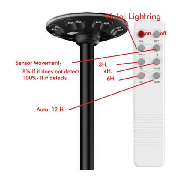 El tiempo de carga de la farola solar es de 6-8 horas, dependiendo de la intensidad de la luz solar disponible. La farola incluye un mando de control remoto, lo que permite al usuario encender o apagar la luz cuando lo desee, así como ajustar el brillo y la intensidad de la luz. Además, cuenta con un sensor de presencia PIR, lo que asegura que la luz se encienda automáticamente cuando detecta movimiento en el área, y se apague después de un tiempo determinado sin movimiento, ahorrando así energía.