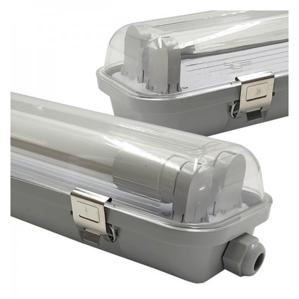 Pantalla estanca diseñada específicamente para dos tubos LED de 120cm. Dispone de una protección IP65 de modo que es apta para exteriores. Está compuesta por base de ABS y difusor resistente al calor fabricado en Policarbonato.