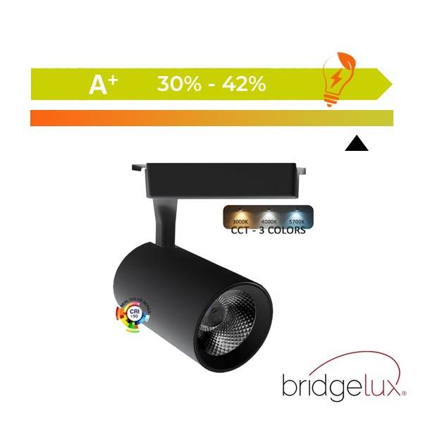 Le rail d'éclairage LED CCT Parma 30W, équipé de la puce Bridgelux, offre la possibilité de choisir entre trois températures de couleur (3000K, 4000K, 5700K), s'adaptant à vos besoins spécifiques et créant l'atmosphère parfaite. Avec un IRC de +92, il garantit des couleurs vibrantes et authentiques qui mettent en valeur les détails et offrent une atmosphère immersive et professionnelle. Son angle d'ouverture de 48º permet de focaliser la lumière avec précision sur les éléments clés. Parfait pour les environnements modernes et élégants.