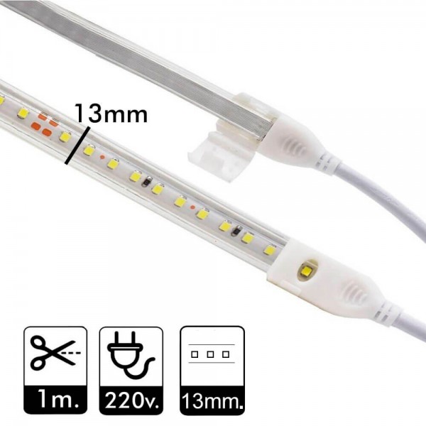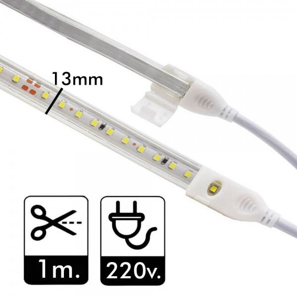 RUBAN LED 220v. A LA COUPE- Le produit comprend : Câble redresseur + Bande LED + Embout. Mesure : 13 mm. 120 diodes SMD2835 par mètre sont connectées directement à l'alimentation électrique par un câble redresseur nécessaire pour une utilisation en extérieur.