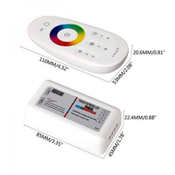 Contrôleur tactile pour rubans LED RGBW radiofréquence . Vous pouvez contrôler un maximum de 216 W à 12 volts . Vous pouvez synchroniser jusqu'à 3 contrôleurs pour une utilisation avec une seule télécommande .