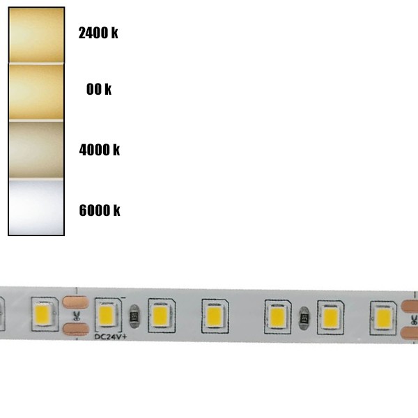 Fita LED PROFISSIONAL 12W por metro, 24V com comprimento de 5 metros. Foi pensado para colocação em interiores, além de ser perfeito para decorar diversos espaços. Requer fonte de alimentação e é conveniente instalá-la sobre um perfil de alumínio para obter uma boa dissipação de calor.